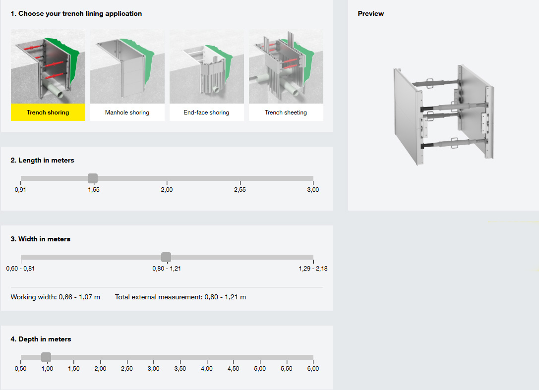 With our new trench lining configurator, you can create a precise configuration for your shoring situation in just a few steps: